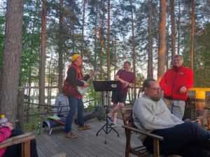 Koulutuksen jälkeen siirryimme majalle kuulemaan Kalikkakasa-trion musiikkia, kun meille esiintyivät Petri Keinonen, Pekka Gröhn ja Jussi Harju. Keikka oli upea, ainutlaatuinen kokemus Taruniemen kesässä. Illalla grillailimme yhdessä vartaita kodalla ja saimme kuulla lisää Keinosen Petrin musiikkia. Kalikkakasa on Kari Hotakaisen runokokoelma. Sen pohjalta Petri on säveltänyt ja sovittanut levyn verran musiikkia yhteisössä kirjailijan kanssa.